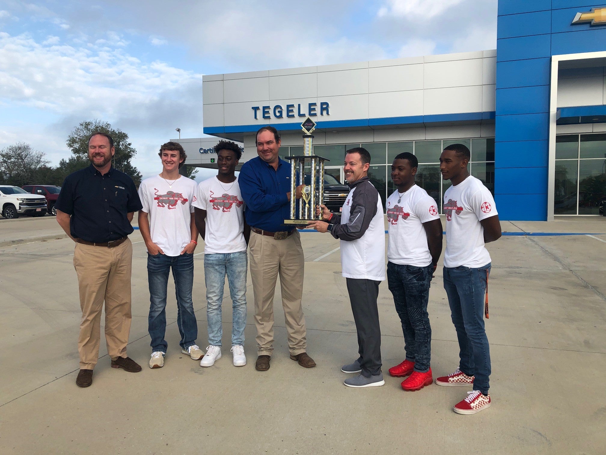 For all the hard work and dedication the Houston area Chevy dealers and Tegeler Chevrolet Inc. is proud to present the inside high school sports Chevy Spotlight trophy to the Bellville football team Coach Rowe and hiscoaching staff congratulations on all your success this season!!